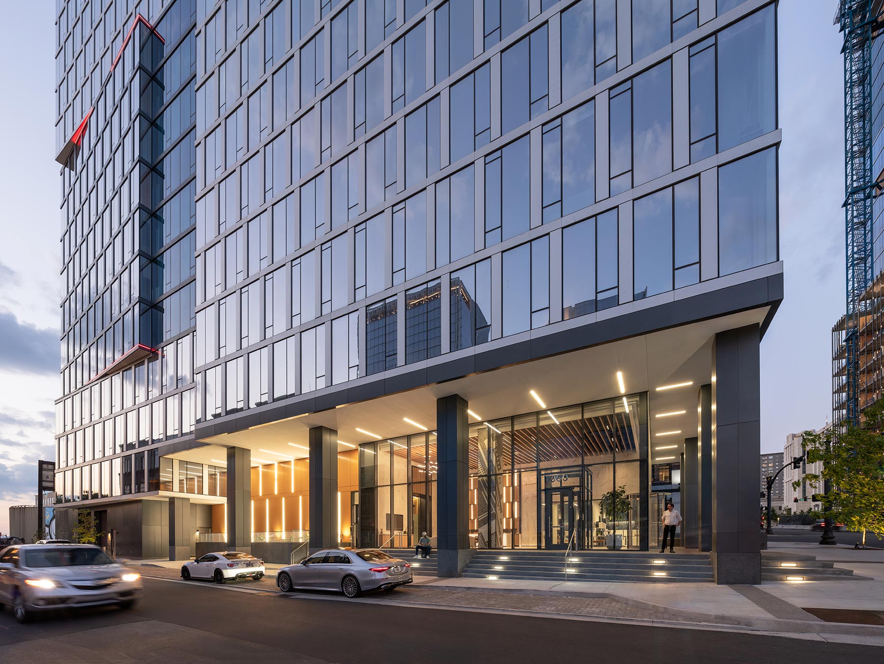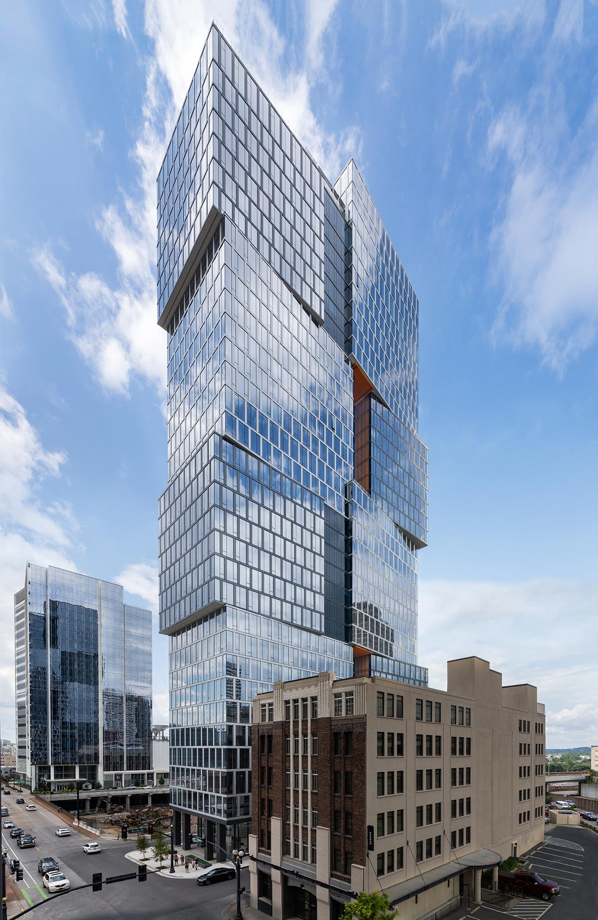 Striking new luxury residential 34-story tower designed by Goettsch Partners (GP) in downtown Nashville, adjacent to the Amazon anchored Nashville Yards development. RKO provided Design Assist services for the building envelope from Design Development phase through Construction