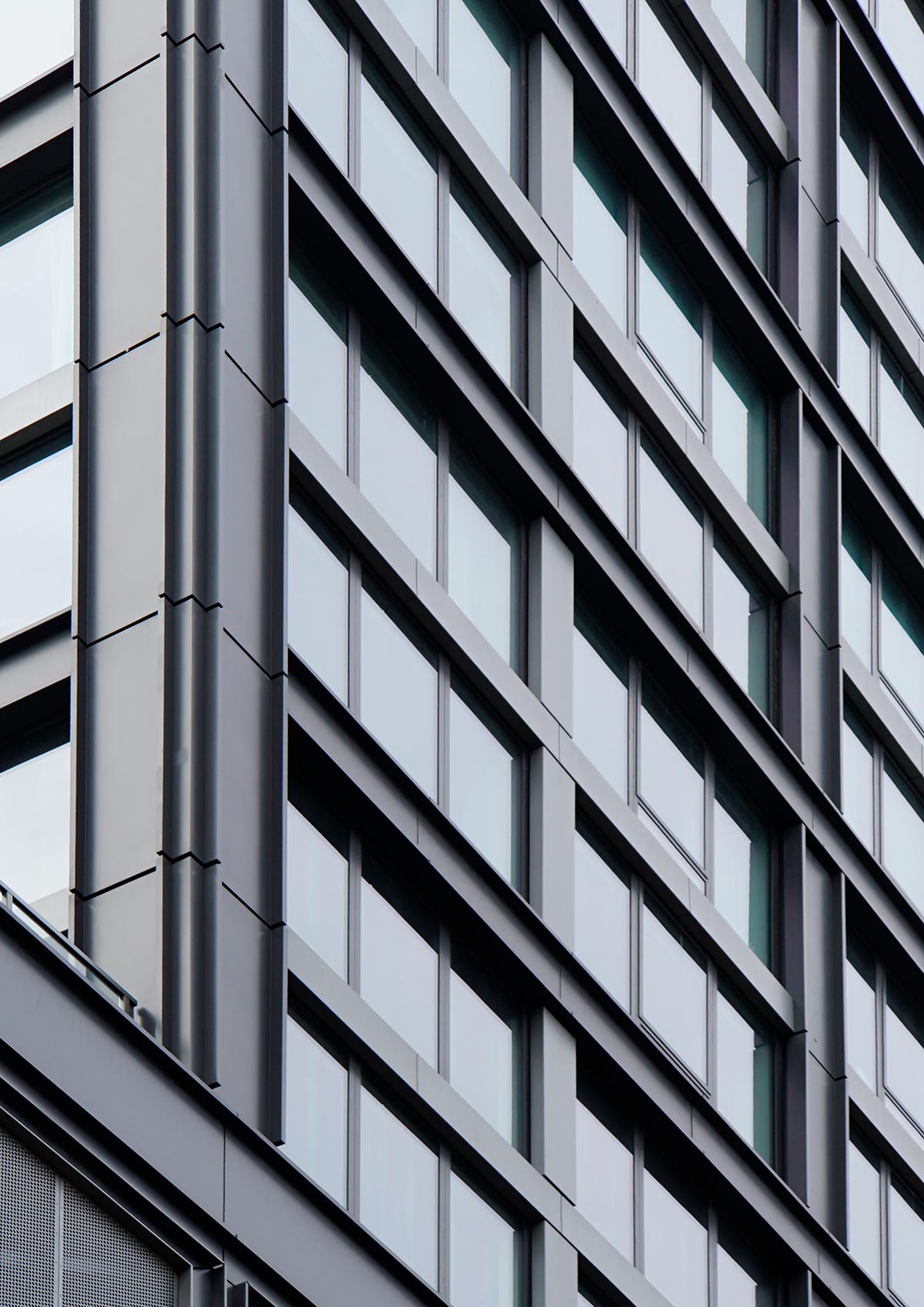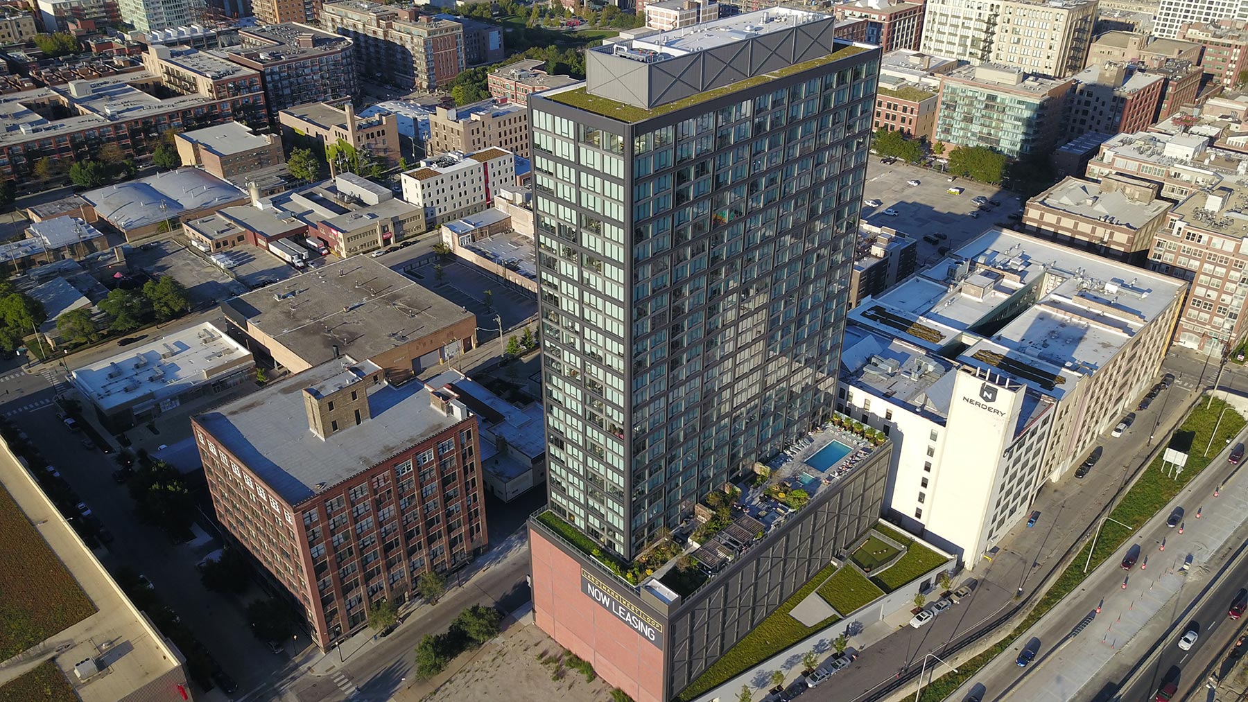 The tower is clad in interwoven metal channels that recall the slender I-beams rising up Mies van der Rohe’s Lake Shore Drive Apartments. A secondary grid of metal panels subdivides the glass bays of floor-to-ceiling windows, creating a composition that echoes the façades of nearby warehouses and former manufacturing buildings.