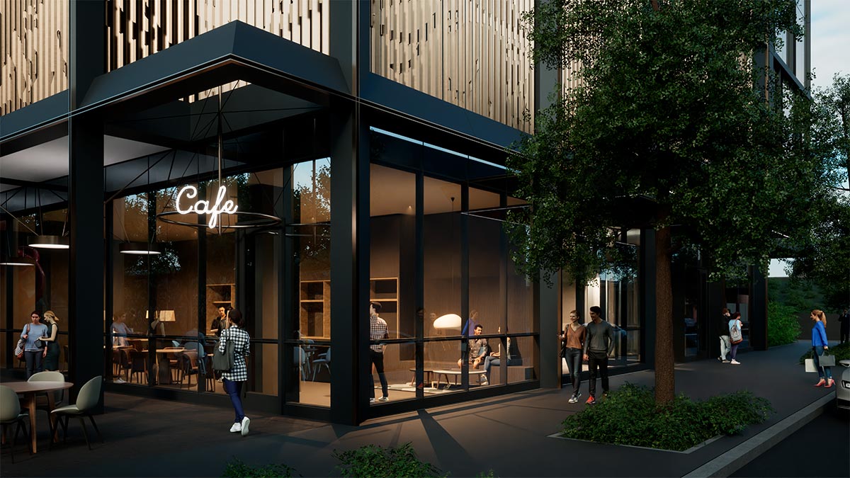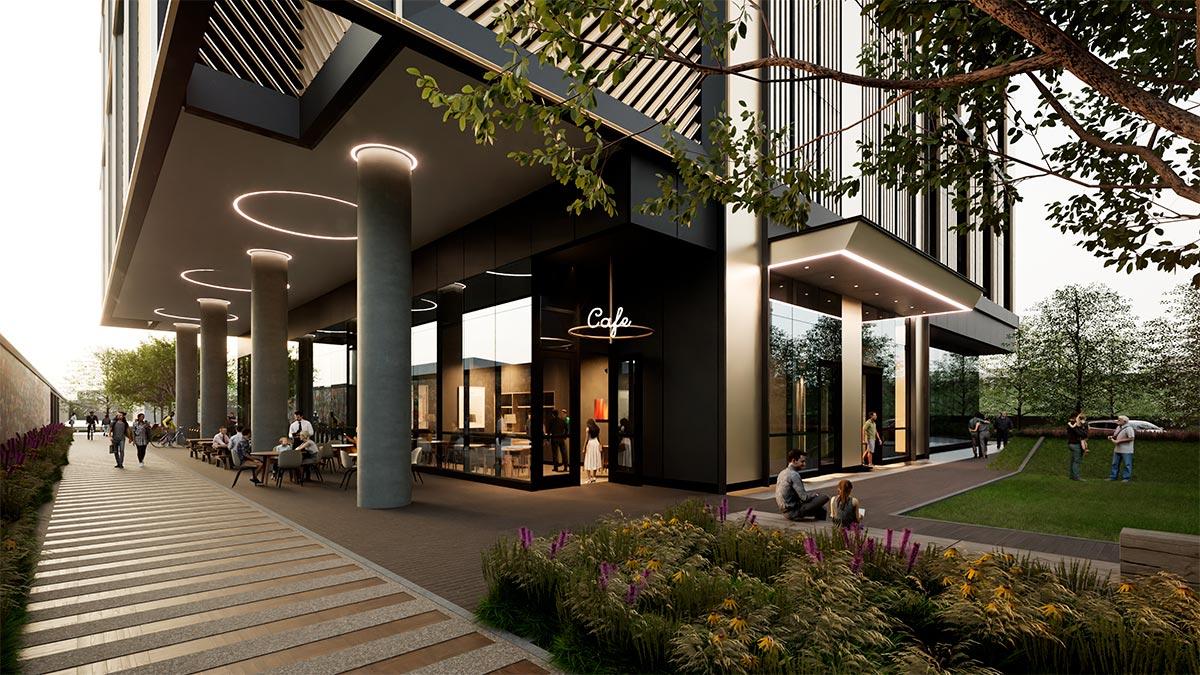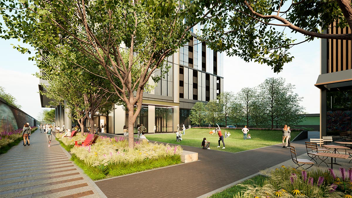 Confluence, the landscape architect for the project, has designed a tree-lined plaza, flexible turf lawn, and pedestrian-friendly pathways to create a vibrant community space.