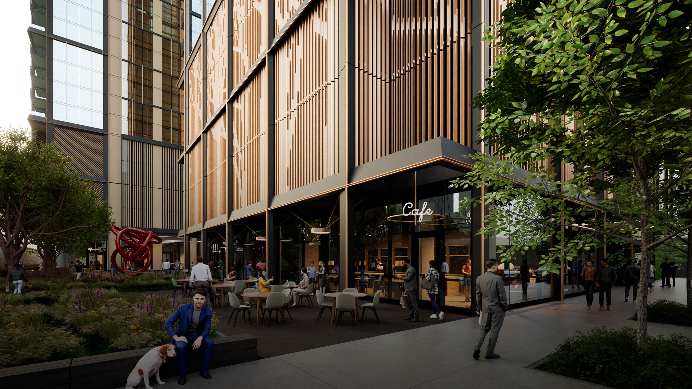 Confluence, the landscape architect for the project, has designed a tree-lined plaza, flexible turf lawn, and pedestrian-friendly pathways to create a vibrant community space.